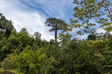 At the entrance to Site B there was a tree laden down with a fruit called ciku. Hanis tried using a blade on a long pole to harvest some fruit, but that wasn’t very successful. So her not-so-young workman simply climbed up the tree like a youngster! You might just be able to see his red hat at the top of the tree (in the photo below right). The fruit tastes a bit like a caramel peach and it all ended up in our breakfast smoothies.
