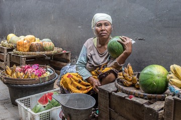 Mr Hari (our guide in eastern Java) had suggested we visit the Pasar Pebean, or Spice Market. As we walked down the narrow back streets, it was clear that Westerners were not normally seen in these parts! It felt a little uncomfortable, but as intrepid travellers, we just marched onwards! The roads were crowded and lined with stalls selling fresh fish; it was quite fascinating to see. Note below the lady in a pedicap with fish at her feet.