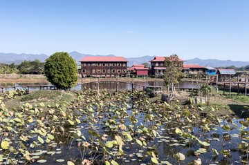 Lotus weaving is a speciality of the Intha people who live around Inle Lake, whose shallow water is ideal for growing lotus plants. The weavers work in the red-topped buildings dotted together on Inle Lake The spiky stems are cut and the two ends pulled apart and twisted to collect together the fine fibrous threads inside. The resulting woven fabric is linen-like and gets softer with washing.